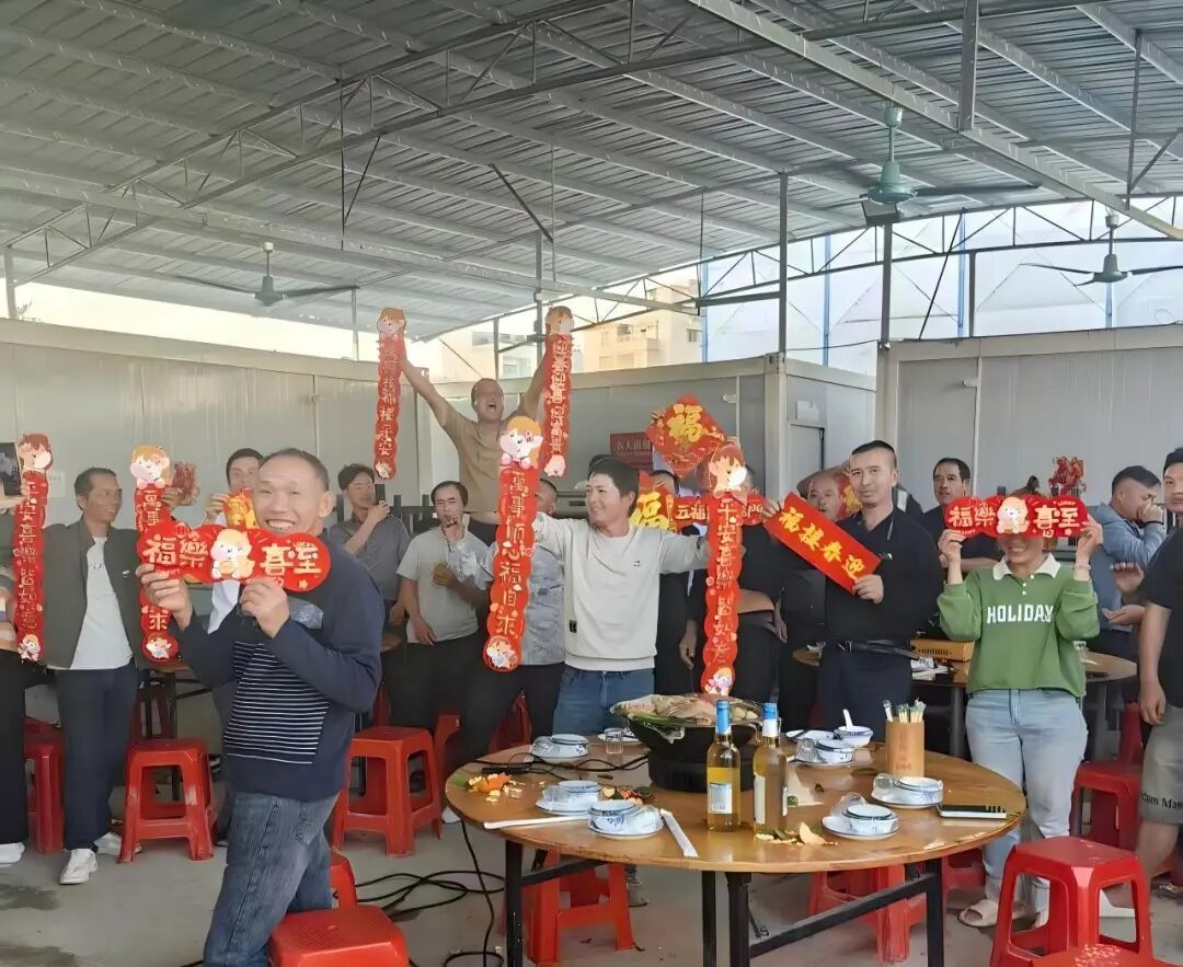 除夜夜,39名在岗工东谈主王人聚表情饭堂,盆菜宴温顺开席,烈烈轰轰。饭堂墙上贴满手写“福”字,年味彻底。不外,表情建议“除夜不喝酒”,强调施工安全是首位。