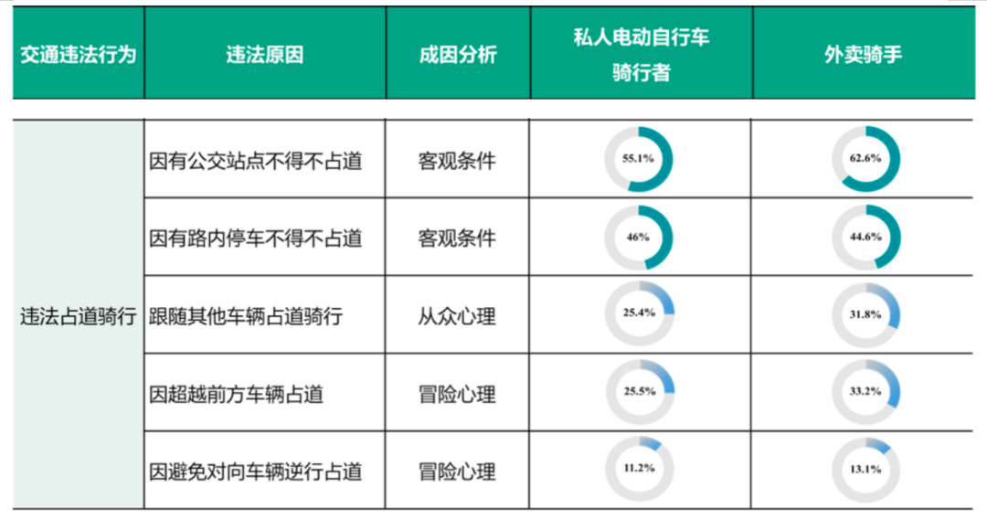 各样型电动自行车骑行者凸起交通行恶举止成因的占比分析(图源:公安部说念路交通安全盘选取心)